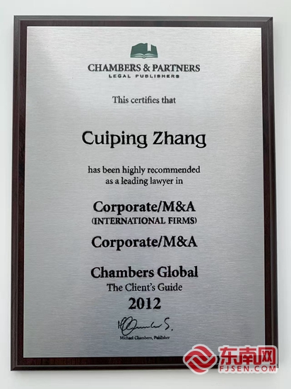 2012年、2013年,张翠萍连续两年荣登国际权威法律评级机构钱伯斯“全球杰出律师”榜单。