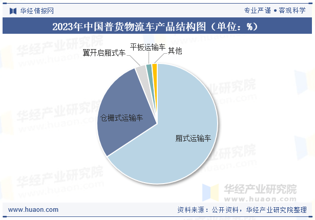 根据中国物流与采购联合会数据显示,2024年,全国物流运行总体平稳,全国社会物流总额360.6万亿元,同比增长5.8%,货运量、货运周转量、快递业务量等位居世界前列,仍然是全球需求规模最大的物流市场。普货物流车的典型产品主要为厢式运输车和仓栅式运输车,2023年两者销量占整个普货物流类产品的93.92%。