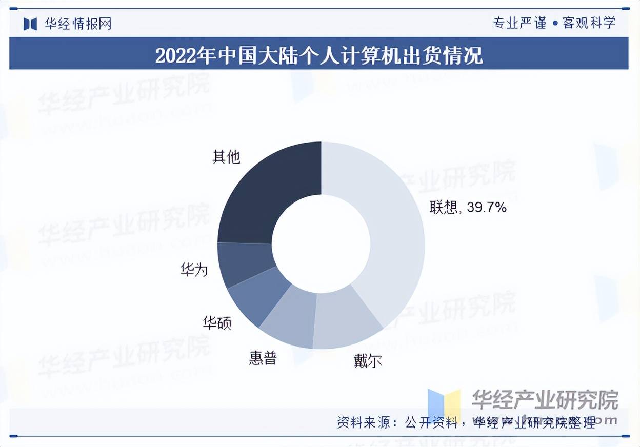 就个人计算机领域而言,我国大陆个人计算机行业市场集中度较高,据统计,2022年中国大陆个人计算机出货量前五家企业分别为联想、戴尔、惠普、华硕和华为,市场占有率总和为75.5%。其中,联想出货量最大,为1925.3万台,市场占有率为39.7%。