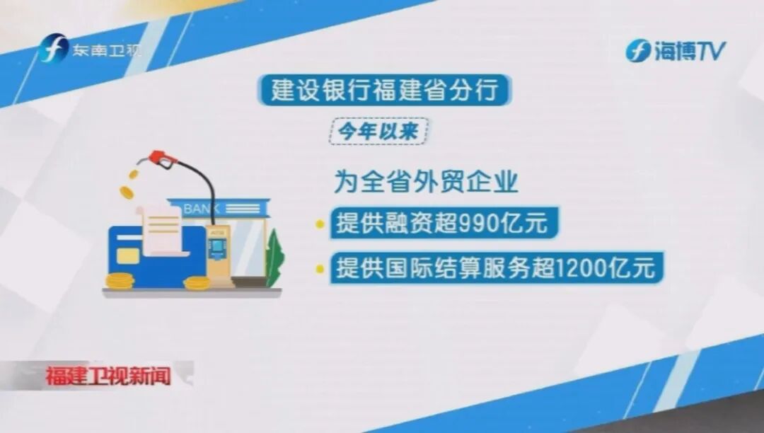 8月27日,福建电视台【福建卫视新闻】播出“福建:特色融资为外贸企业增添新动能”,聚焦建设银行福建省分行深化“信贷+汇率+平台”三维驱动,联动境内外机构引入低成本资金,创新推出“跨境快贷”“出口信保融资”等特色产品,推进外汇便利化,用好汇率避险工具,精准服务外贸企业。