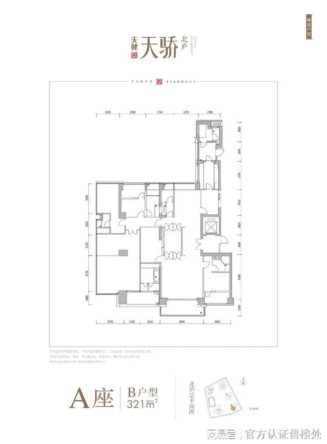 A座建筑面积约321㎡户型:东南朝向,通透布局三面采光,户型方正空间宽敞。客厅开间5.8米,带有2.2米进深大阳台。四套间配置,主卧空间奢侈,采光优秀空能全面。5阳台配置功能全面,餐厨空间宽敞独立,带有独立家政阳台和工人房。