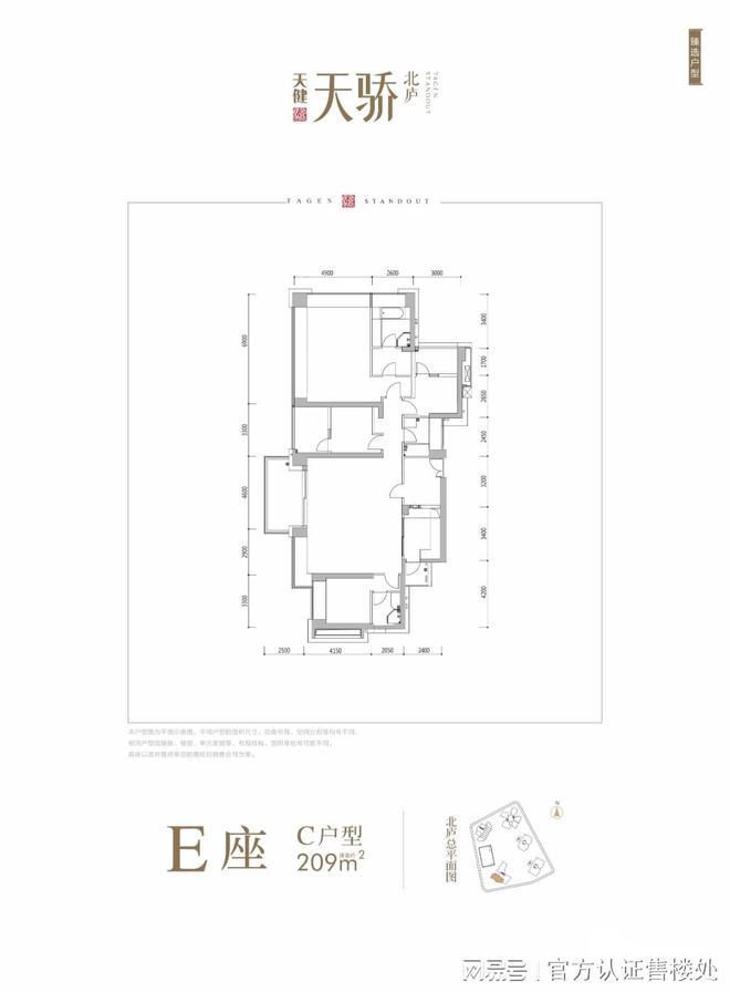 E座建筑面积约209㎡户型:偏西南朝向,大开间短进深,主要生活空间光照充足。餐客厅开间7.5米,客厅带有2.5米进深大阳台,宽敞舒适。双套间配置,主卧空间宽敞,双面采光,功能全面。公共区域宽敞舒适,入户玄关自然通风采光,功能强大。