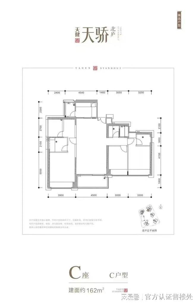C座建筑面积约162㎡户型:东南西朝向,大开间短进深,主要生活空间光照充足。4.5米客厅开间,带有1.8米进深大阳台。双套间配置,开间进深比良好,空间利用充分,采光优秀。双次卧开间进深比良好,都可以做主卧室使用。餐厨空间宽敞舒适,厨房带有独立生活阳台,可与厨房合并使用。