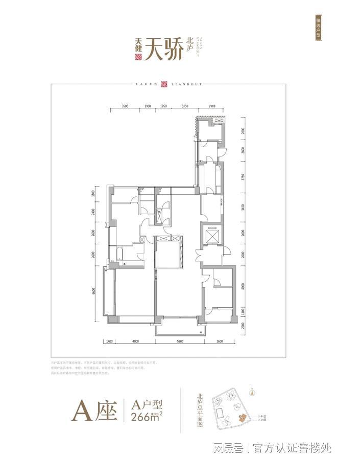 A座建筑面积约266㎡户型:东南西朝向,通风采光性能优秀,主要生活空间光照充足。客厅开间5.8米,带有2.2米进深大阳台,宽敞明亮。主卧尺度阔绰,功能全面双面采光,带有独立阳台和衣帽间。三套间配置,北向房间可独立使用,也可分割成两个小房间使用。餐厨空间宽敞独立,带有独立家政阳台和工人房。